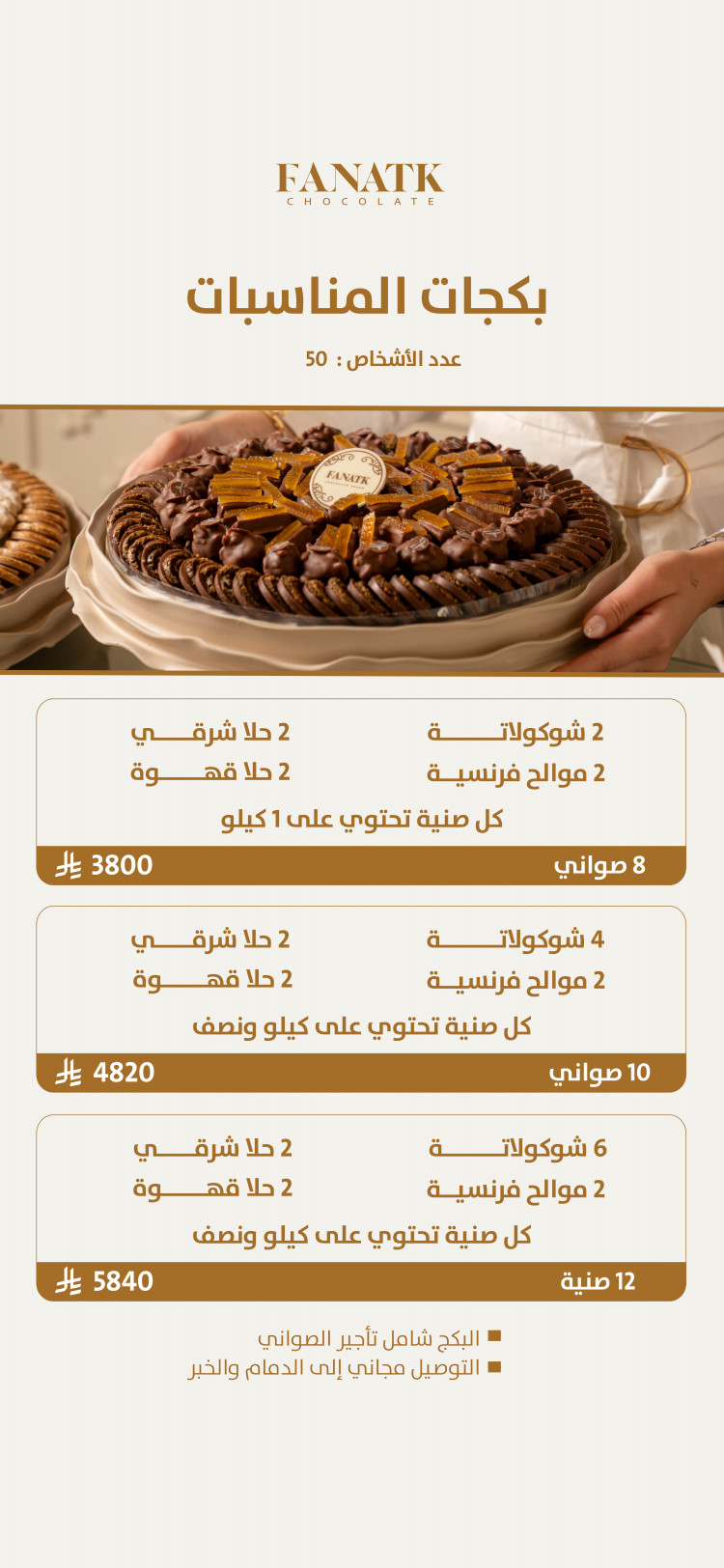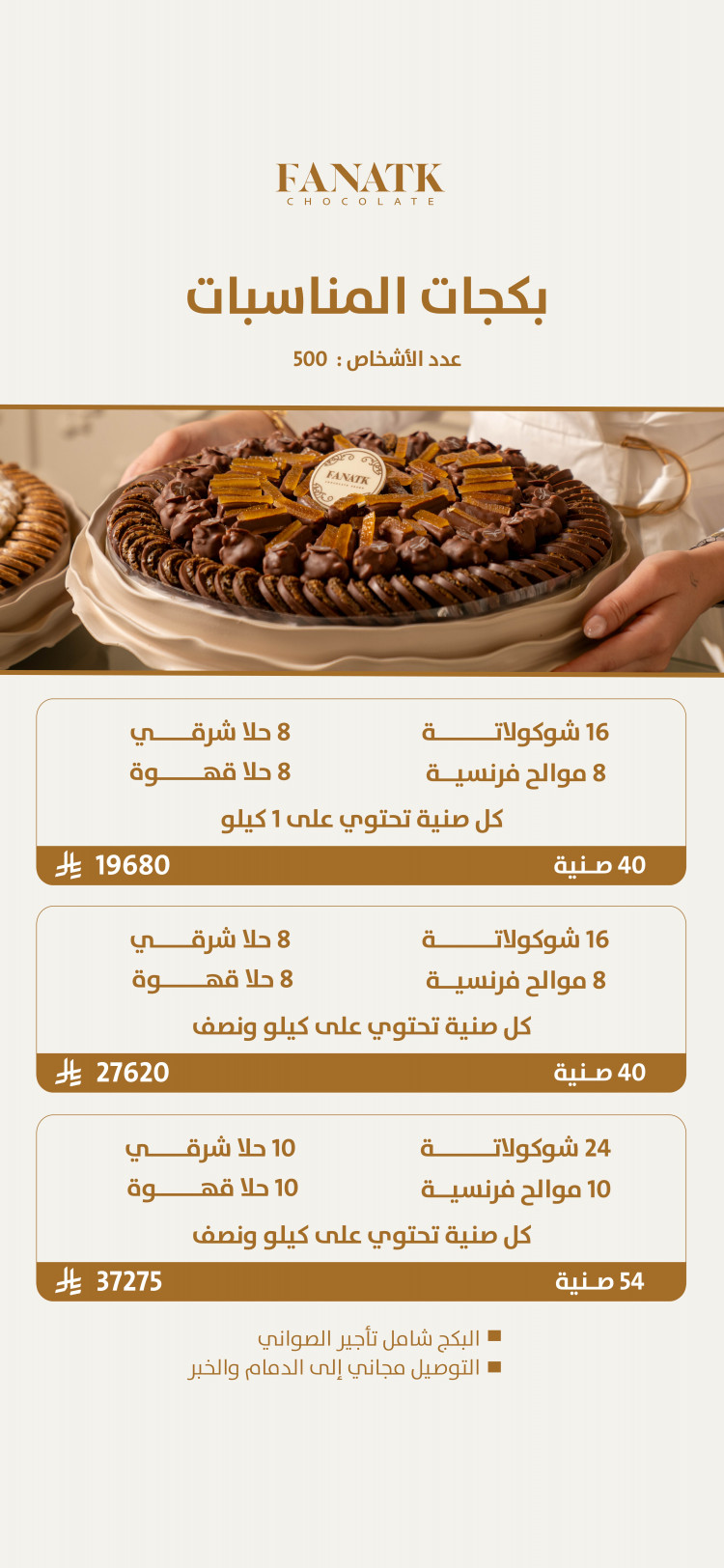 نحرص على استخدام أجود أنواع الشوكولاتة العالمية، مع تنسيقات عصرية ومرنة تناسب كل الأذواق، ونسعى باستمرار لتطوير تصاميمنا بما يتماشى مع آخر صيحات الضيافة والاحتفالات.